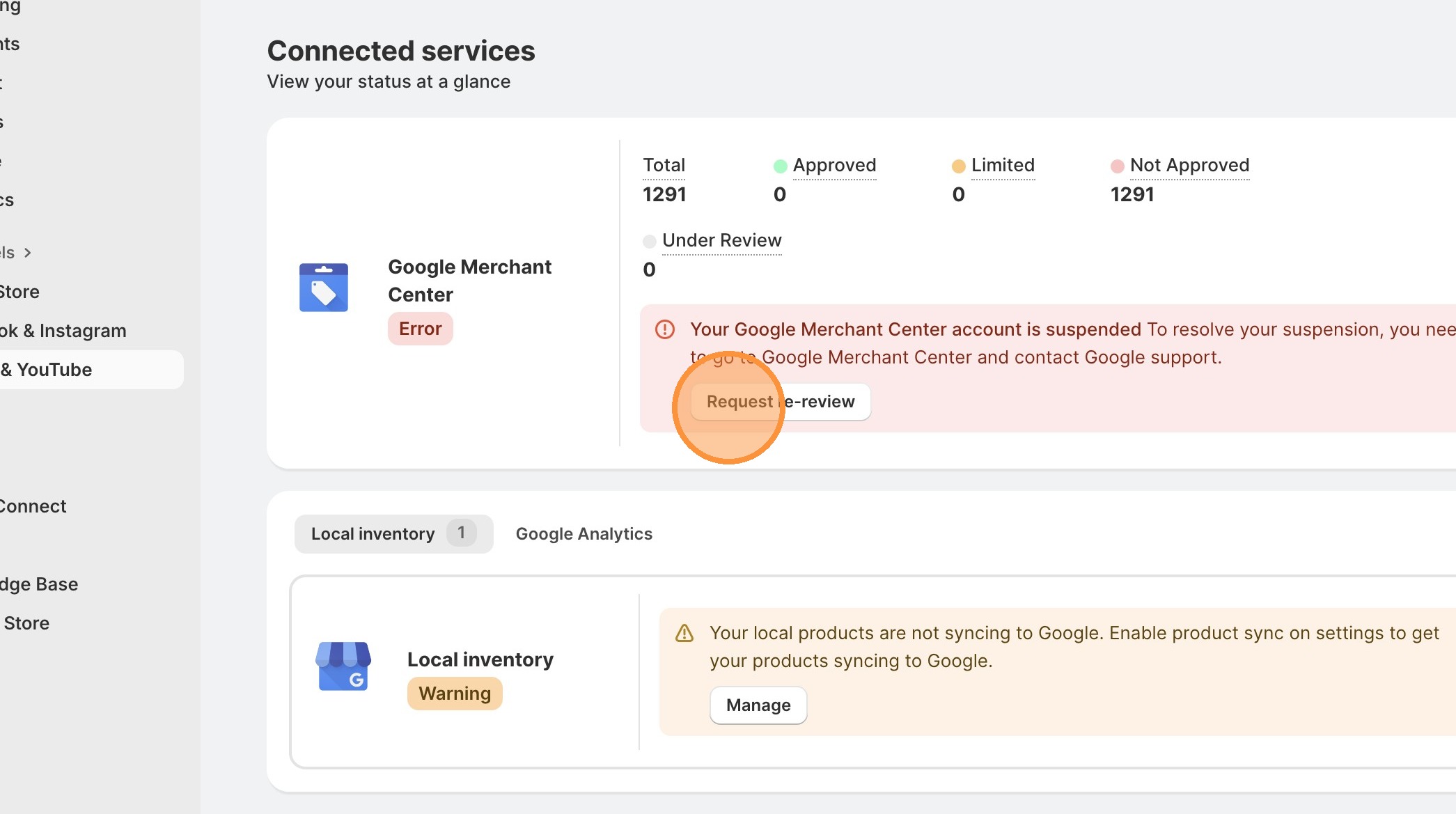 This is the dreaded red box in your Shopify store Google & YouTube sales channel.