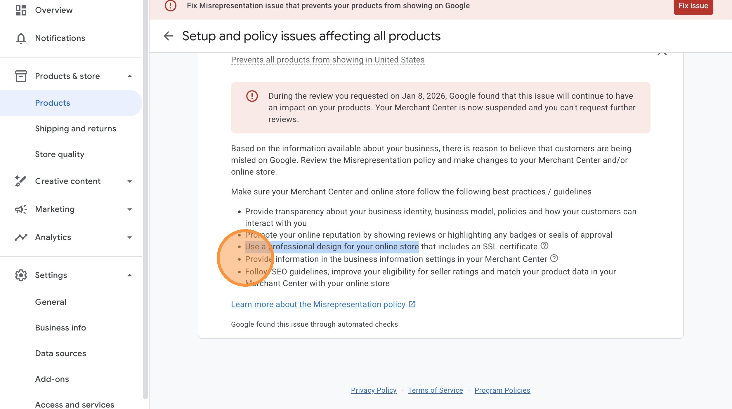 Google's scanners compare your product feed data (what the Google app sends to Merchant Center) against your live website. If anything doesn't match, you're flagged.