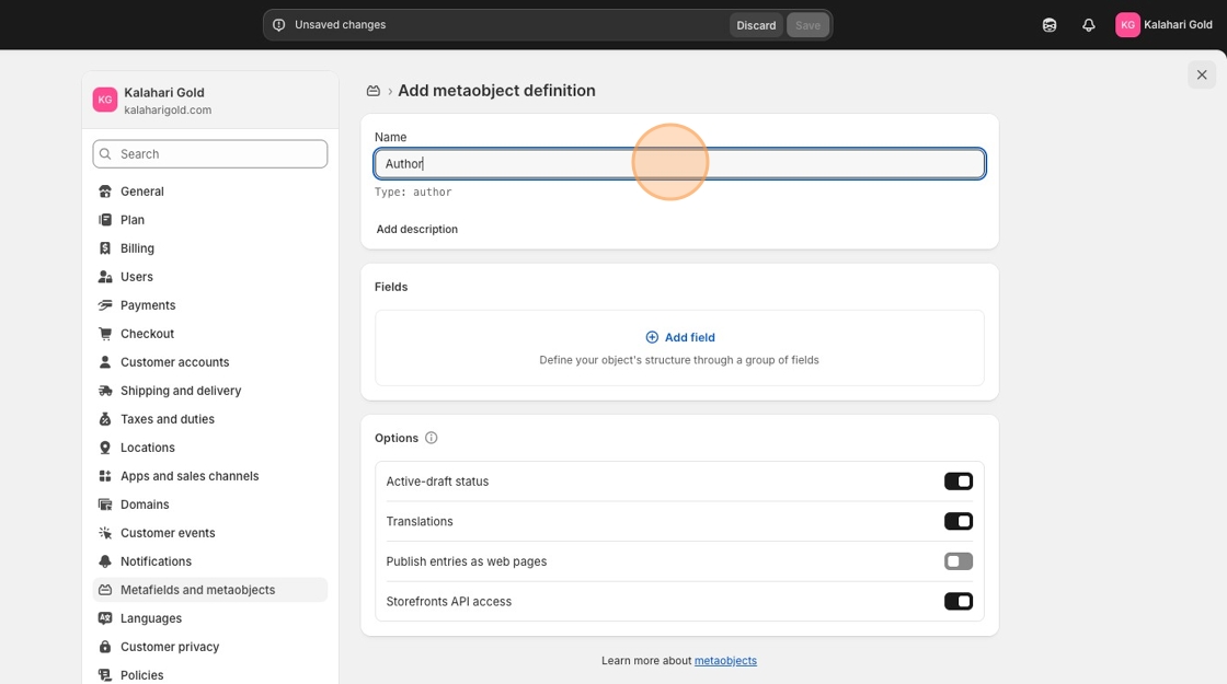 - In the same Custom Data screen, you'll see "Author" under Metaobjects